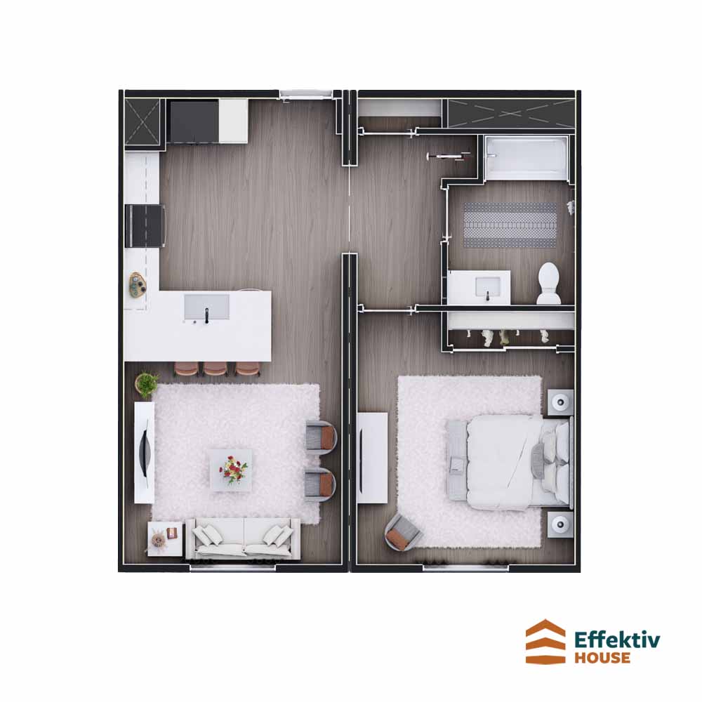 24’10” width, 28’0″ length, 581 sq ft, 1 bed, 1 bath, 1 story, 2 sections