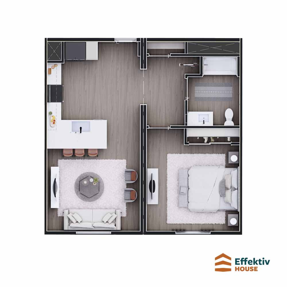 26’10” width, 28’0″ length, 639 sq ft, 1 bed, 1 bath, 1 story, 2 sections