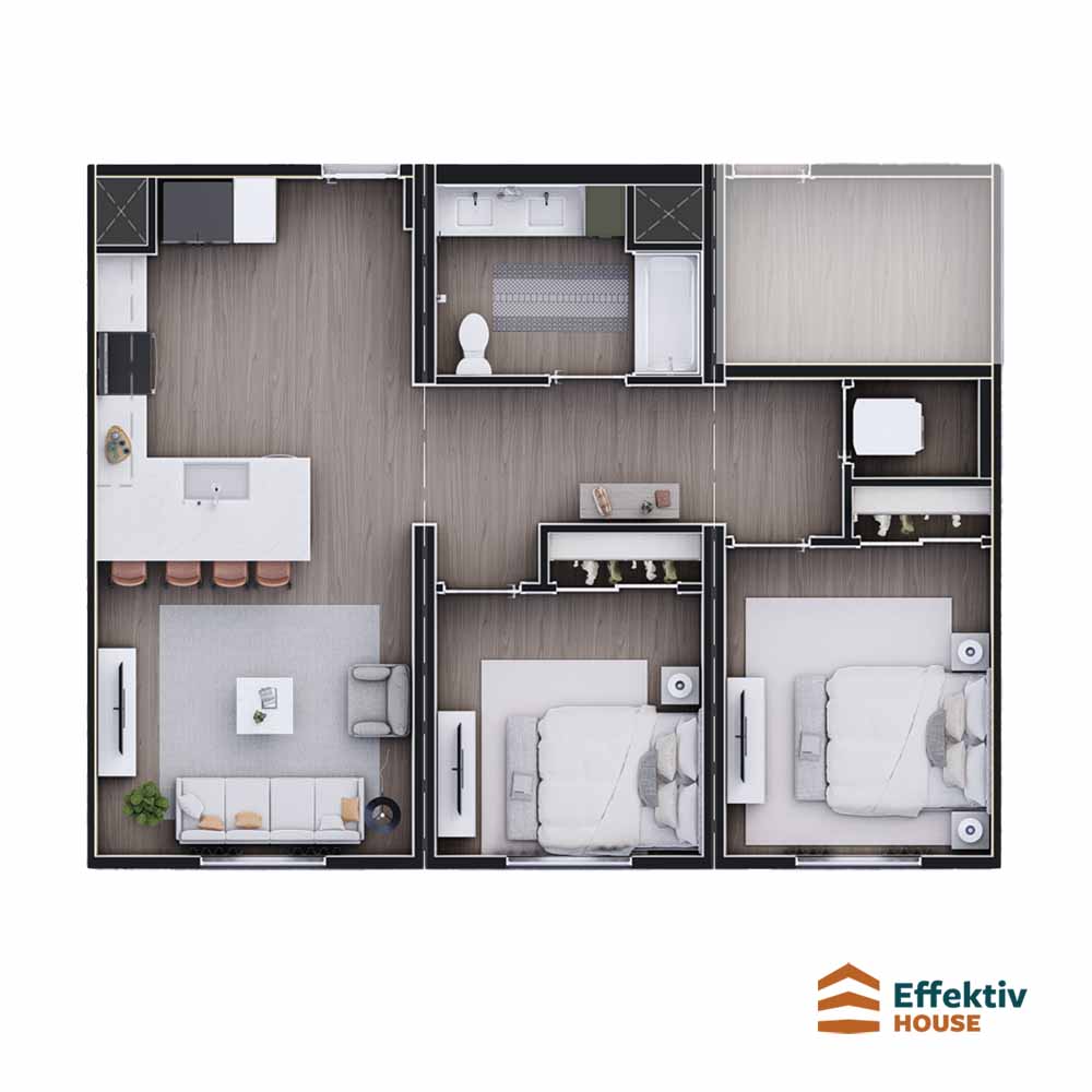 34’4″ width, 30′ 8″ 28’0″ length, 853 sq ft, 2 bed, 2 bath, 1 story, 3 sections