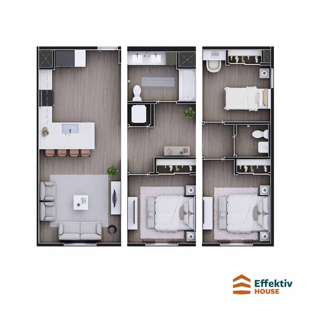45’10” width, 28’0″ length, 986 sq ft, 3 bed, 2 bath, 1 story, 4 sections